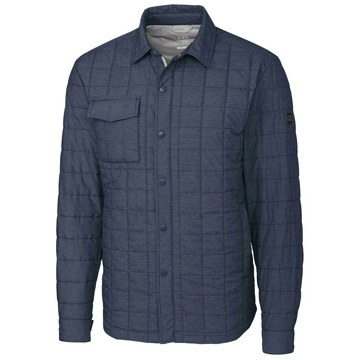 The Cutter & Buck Men’s Anthracite Melange Rainier Shirt Jacket takes two classic pieces of apparel and pairs them together to create a unique piece that defies convention. Its sleek design is the perfect pick if you are looking for a versatile item to show off your company or team’s custom logo or design. Design elements like the shirt collar and front chest pocket make it look like a traditional button-down. Primaloft insulation, water-resistant fabric, and a quilted pattern, however, make it ideal for wear even in inclement weather conditions.