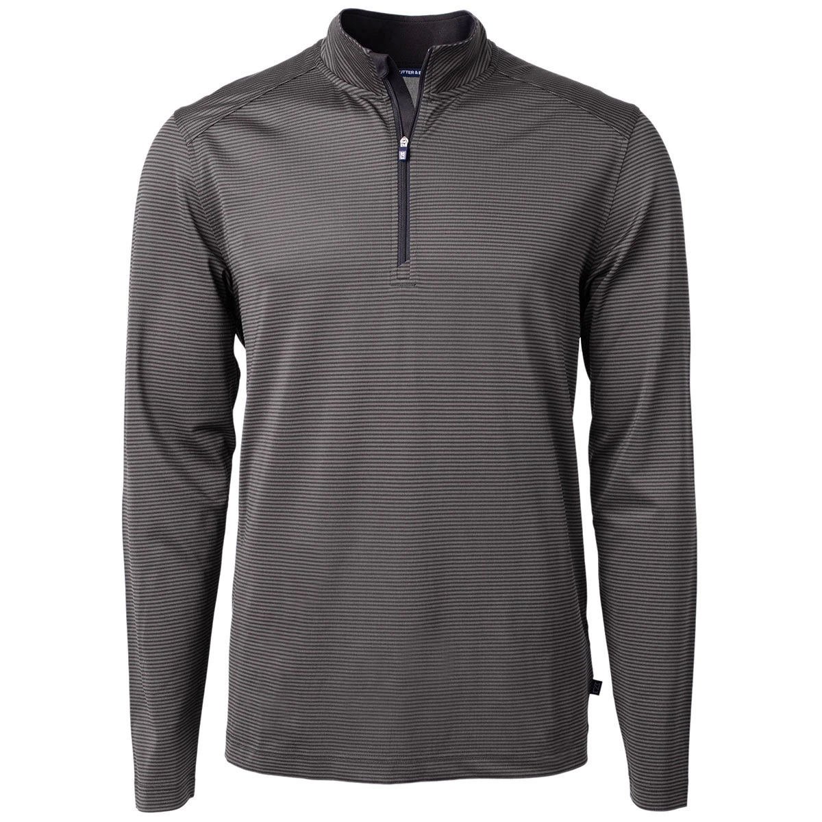 Cutter & Buck Men’s Black/Elemental Grey Virtue Eco Pique Micro Strip Recycled Quarter Zip with an embroidered logo is a must-have for those who enjoy the great outdoors. The sleek, long-sleeve quarter zip has a zippered closure that is easy to layer on those chilly days. Ideal for walking a dog or enjoying a weekend hike, this versatile quarter zip is ready for adventure. Place an order today.