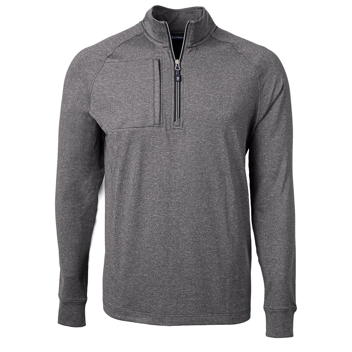 Cutter & Buck Men’s Black Heather Adapt Eco Knit Heather Quarter Zip with a custom logo will have you ready for action. This unique quarter zip is easy to wear and layer, making it perfect for an evening jog or a round of golf in chilly weather. The gorgeous quarter zip is made even more convenient with a chest pocket with side closure for small items that need to be secured. Order yours today.