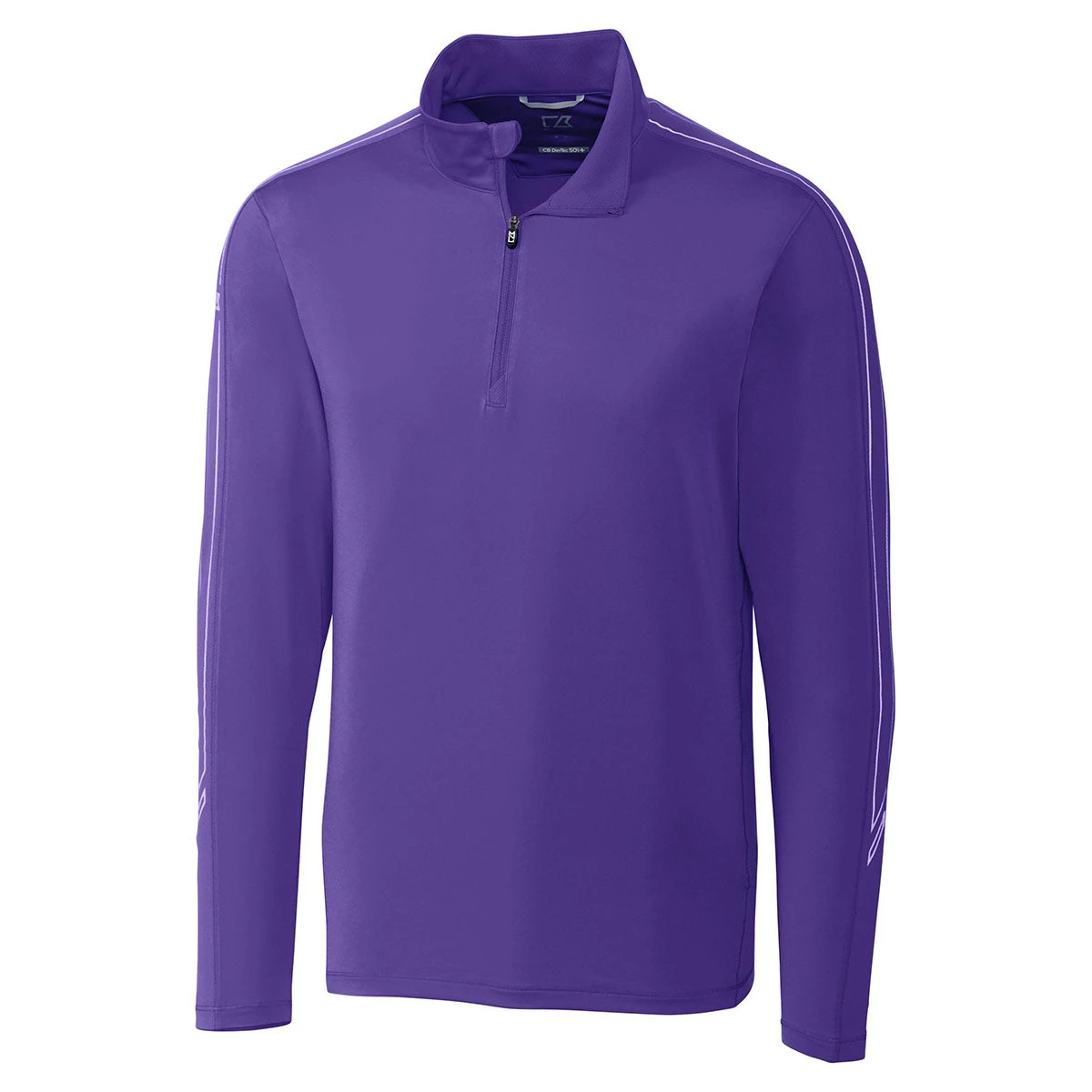 This brand new style Cutter & Buck Men’s College Purple DryTec Pennant Sport Half-Zip top is just waiting for you to place your company’s custom logo on it. The men who receive it will make it their favorite shirt for casual wear. The jersey material is made of polyester and spandex. Not only does it give a handsome silhouette but stretches when you do and retains its shape. It is a half-zip with exposed zipper that has a logoed zipper pull. There are hybrid mesh accents at inside neck, chin guard, zipper garage, and shoulder. It features light weight sun protection with UPF 50, and has a logo reflective stripe on sleeve.