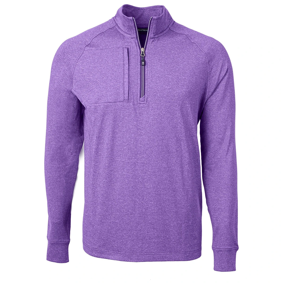 Cutter & Buck Men’s College Purple Heather Adapt Eco Knit Heather Quarter Zip with a custom logo will have you ready for action. This unique quarter zip is easy to wear and layer, making it perfect for an evening jog or a round of golf in chilly weather. The gorgeous quarter zip is made even more convenient with a chest pocket with side closure for small items that need to be secured. Order yours today.