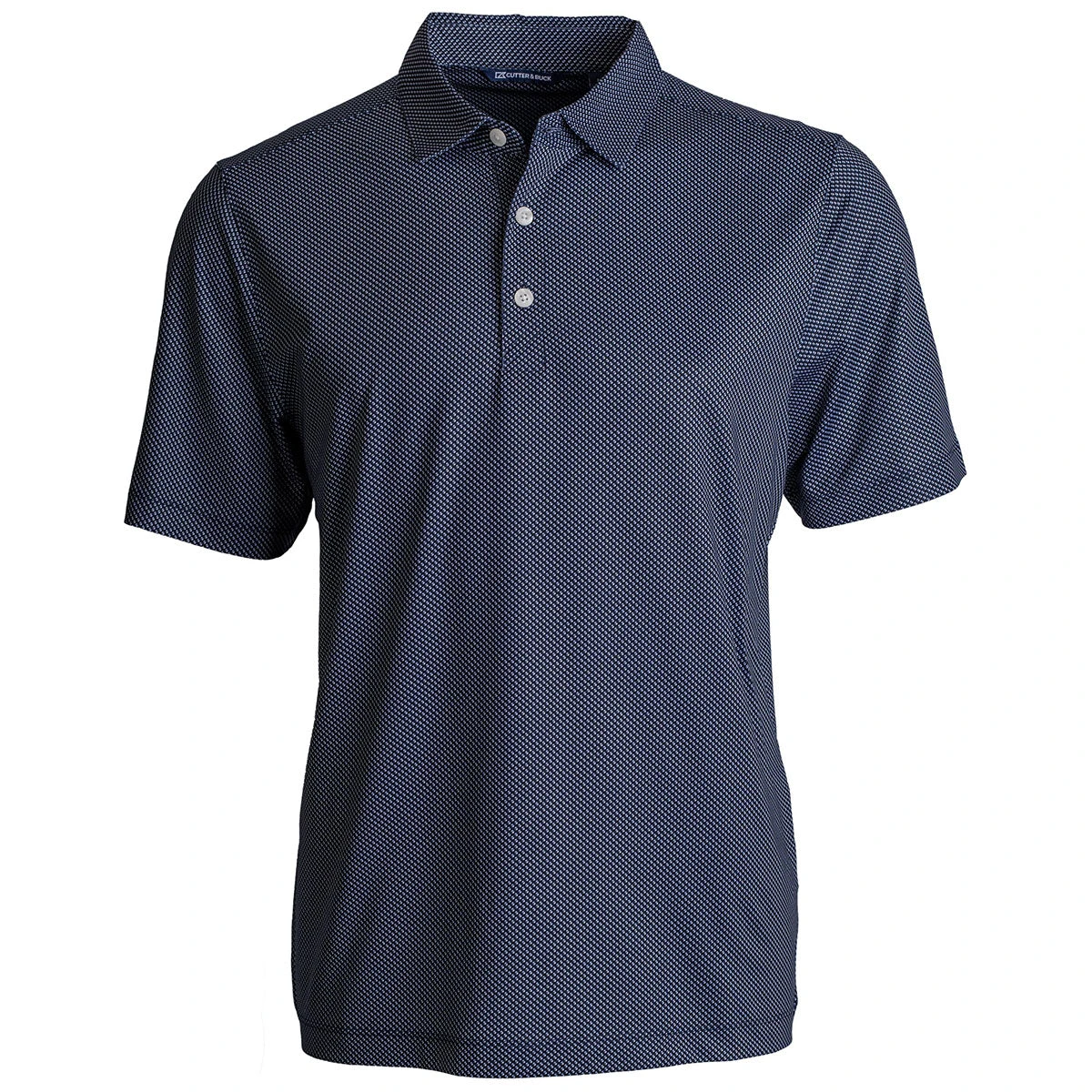 The classic polo now comes in a subtle print and is made with sustainable material. The Cutter & Buck Men’s Navy Blue/White Pike Eco Symmetry Print Stretch Recycled Polo provides style and comfortable all-day wear with UV protection and moisture-wicking abilities. Get the protection you need for a sunny day outside or laid-back luxury in the office.Â