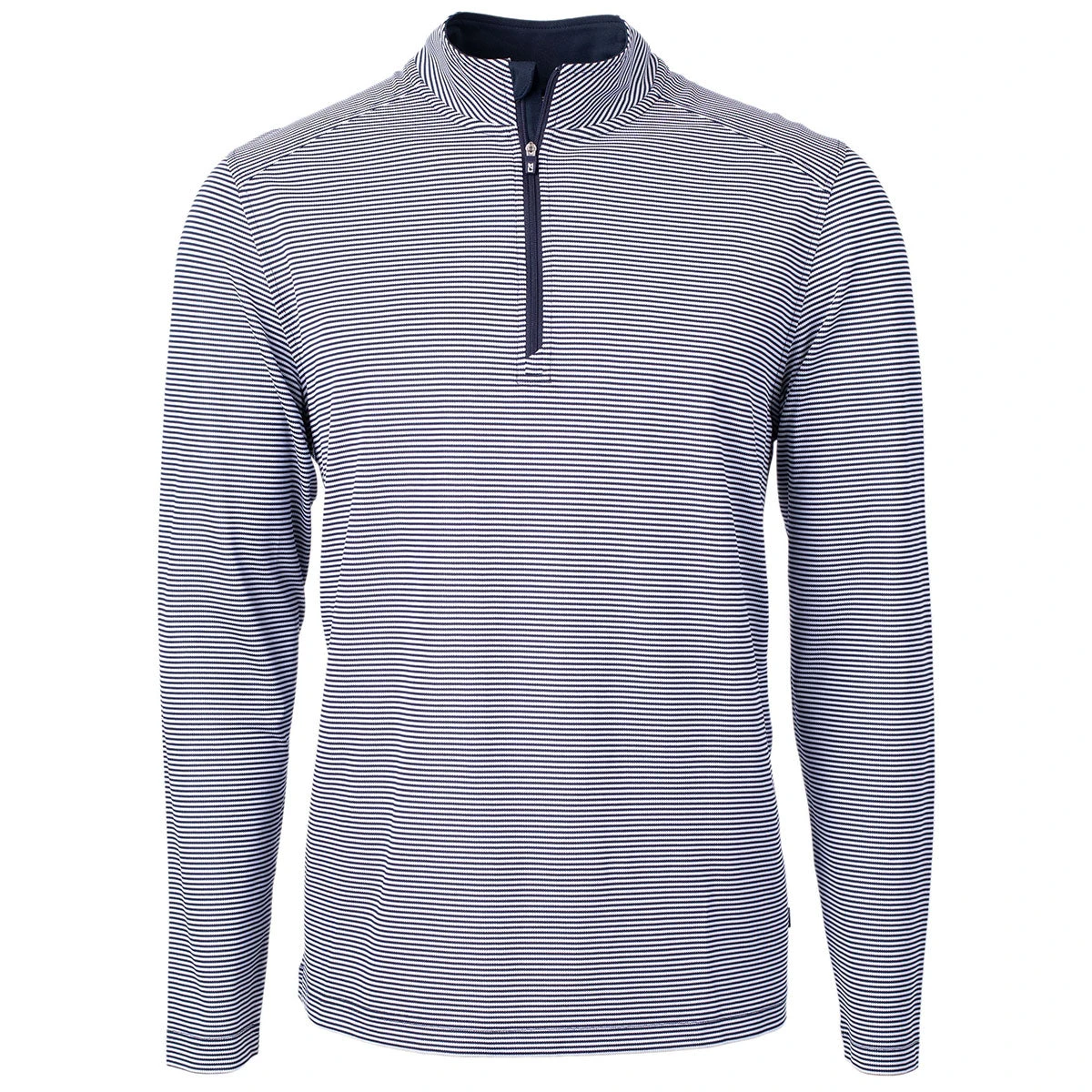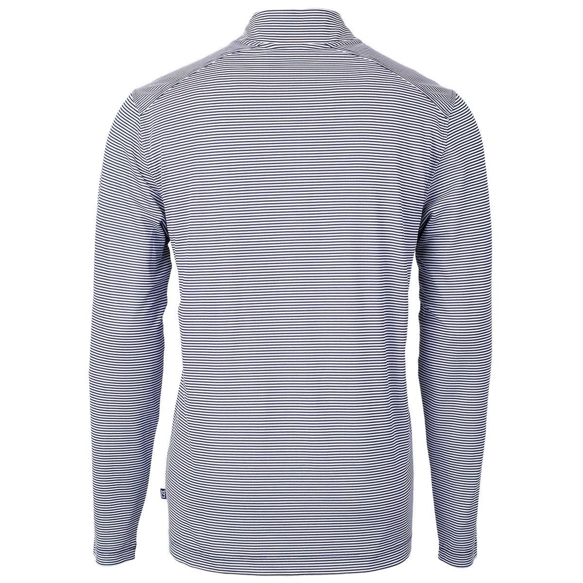 Cutter & Buck Men’s Navy Blue/White Virtue Eco Pique Micro Strip Recycled Quarter Zip with an embroidered logo is a must-have for those who enjoy the great outdoors. The sleek, long-sleeve quarter zip has a zippered closure that is easy to layer on those chilly days. Ideal for walking a dog or enjoying a weekend hike, this versatile quarter zip is ready for adventure. Place an order today.
