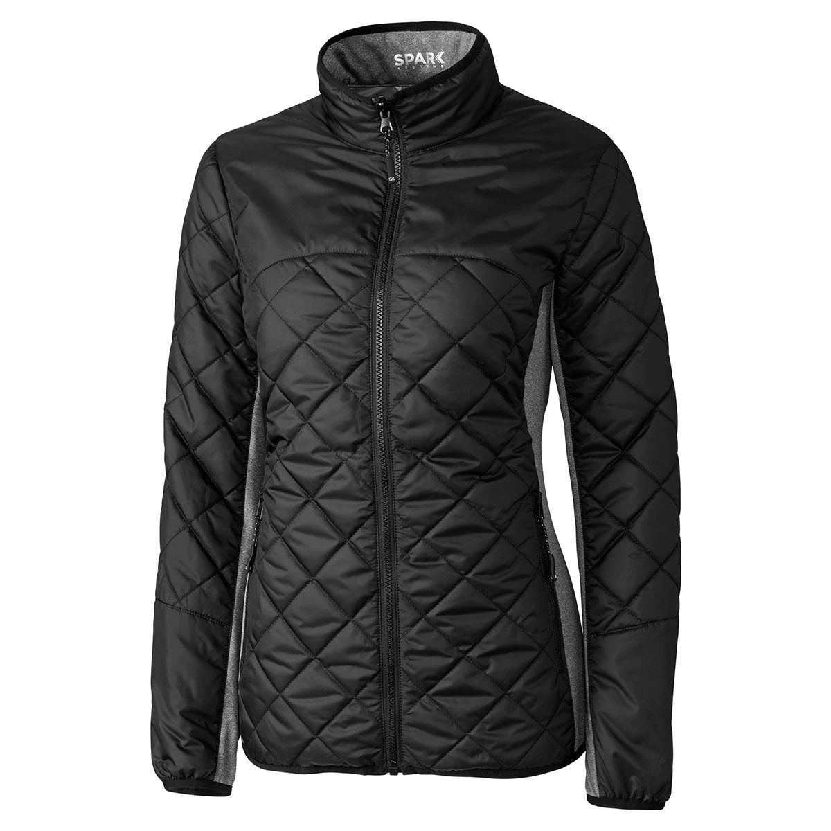This Cutter & Buck Women’s Black WeatherTec Sandpoint Quilted Jacket is a new style that will look chic and fashionable with your company’s logo on it. It has so many desired features. It is plain weave polyester with diamond quilting with knit piecing at side body and underarms. It has a mock turtleneck and a full front zipper. There is arc yoke piecing at front and back body, On-seam exposed front zipper pockets. It zips into SPARK’s program. Naturally, it is water and wind resistant. It also has a packable inside zipper pocket. This jacket is machine washable in cold water on the delicate cycle.