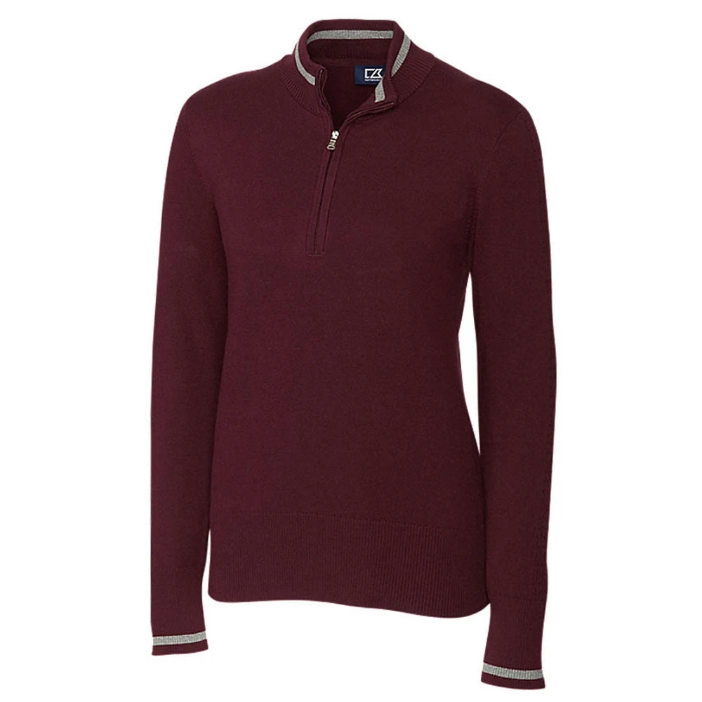 The solid design of this Cutter & Buck Women’s Bordeaux Lakemont Tipped Half-Zip adds a classy look for a casual company event. The cotton and nylon body on this half-zip mock neck features a cable stitch sleeve with a small color accent on the cuffs. That same accent can be found along the collar. The contrast tipping along the collar adds a good fit onto the neck. Order this handsome customizable jacket for a golfing event or any special outdoor corporate occasion. The solid surface makes the perfect canvas for your company’s custom logo.