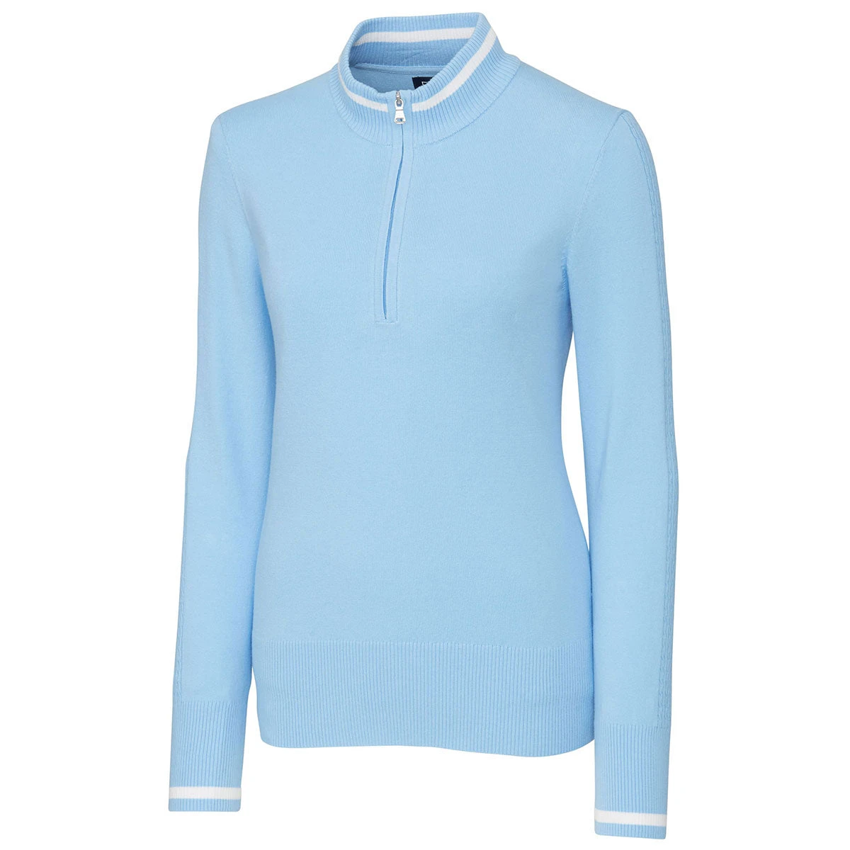 The solid design of this Cutter & Buck Women’s Inlet Lakemont Tipped Half Zip adds a classy look for a casual company event. The cotton and nylon body on this half-zip mock neck features a cable stitch sleeve with a small color accent on the cuffs. That same accent can be found along the collar. The contrast tipping along the collar adds a good fit onto the neck. Order this handsome customizable jacket for a golfing event or any special outdoor corporate occasion. The solid surface makes the perfect canvas for your company’s custom logo.
