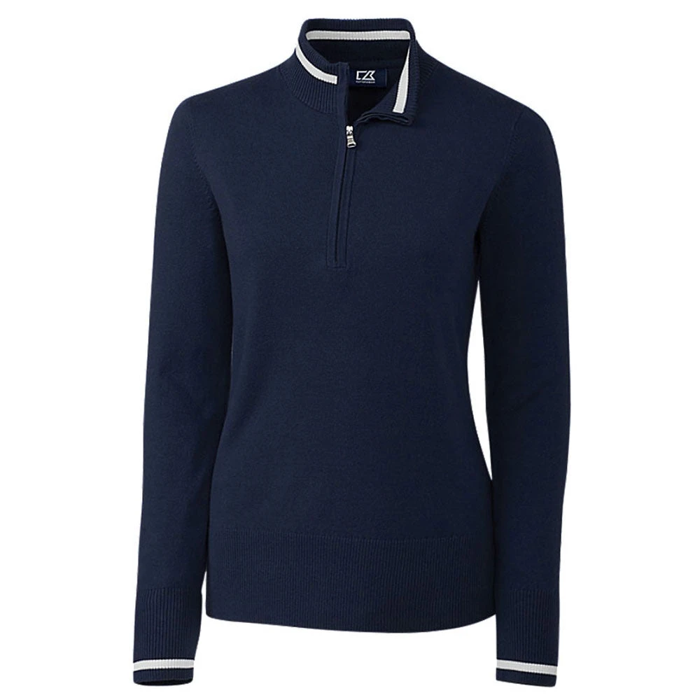 The solid design of this Cutter & Buck Women’s Liberty Navy Lakemont Tipped Half-Zip adds a classy look for a casual company event. The cotton and nylon body on this half-zip mock neck features a cable stitch sleeve with a small color accent on the cuffs. That same accent can be found along the collar. The contrast tipping along the collar adds a good fit onto the neck. Order this handsome customizable jacket for a golfing event or any special outdoor corporate occasion. The solid surface makes the perfect canvas for your company’s custom logo.
