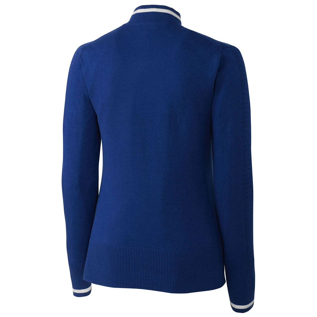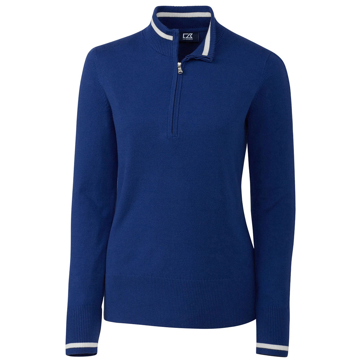 The solid design of this Cutter & Buck Women’s Tour Blue Lakemont Tipped Half Zip adds a classy look for a casual company event. The cotton and nylon body on this half-zip mock neck features a cable stitch sleeve with a small color accent on the cuffs. That same accent can be found along the collar. The contrast tipping along the collar adds a good fit onto the neck. Order this handsome customizable jacket for a golfing event or any special outdoor corporate occasion. The solid surface makes the perfect canvas for your company’s custom logo.